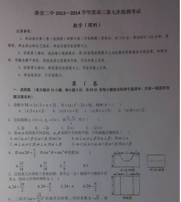 甘肃省秦安二中2014届高三第七次检测(数学理)扫描版