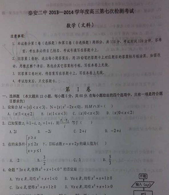 甘肃省秦安二中2014届高三第七次检测(数学文)扫描版