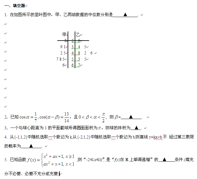 江苏省连云港市东海县石榴高级中学2014届高三数学押题训练 缺答案