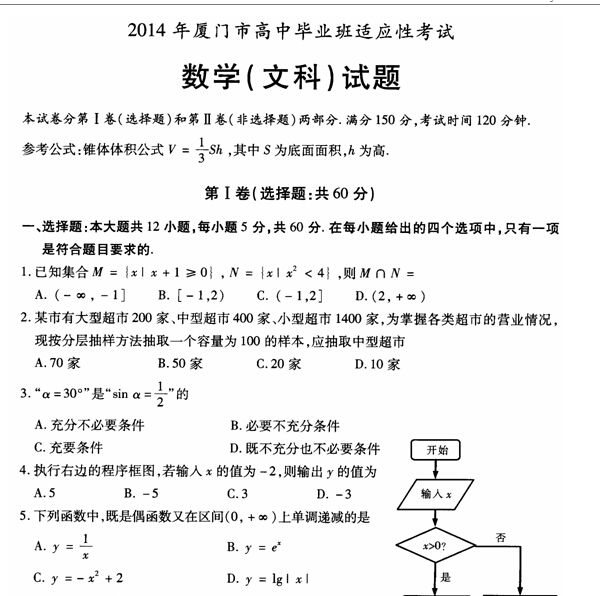 【2014厦门市5月质检】福建省厦门市2014届高三毕业班适应性考试(数学文)扫描版
