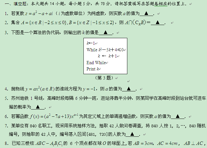江苏省苏州实验中学2014届高三下学期周考试卷(20140517)(数学)