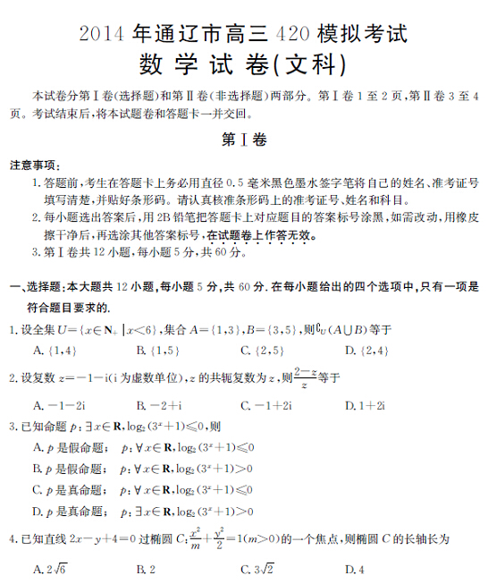 内蒙古通辽市2014届高三4月模拟考试(数学文)扫描版