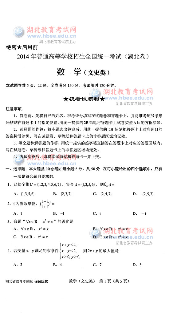 2014年普通高等学校招生统一考试(湖北卷)数学文 扫描版(含答案)