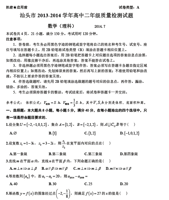广东省汕头市2013-2014学年高二下学期期末考试(数学理)PDF版无答案