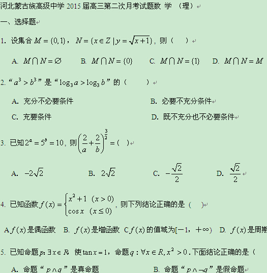河北蒙古族高级中学2015届高三第二次月考(数学理)缺答案