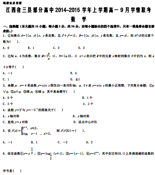 江西省三县部分高中2014-2015学年高一9月联考(数学)扫描版
