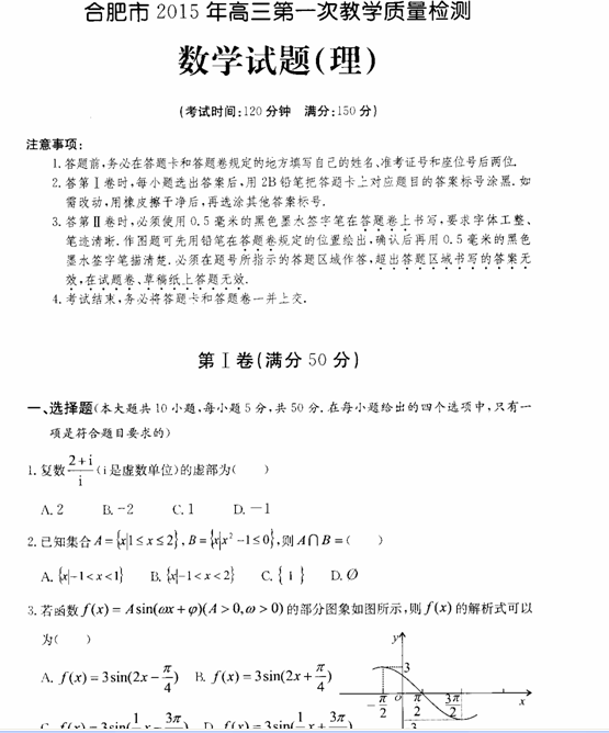 安徽省合肥市2015届高三上学期一模试题(数学理)扫描版