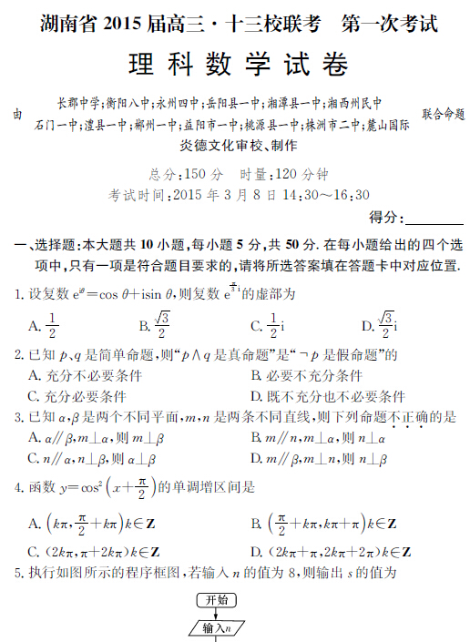 湖南省十三校2015届高三第一次考试(数学理)PDF版
