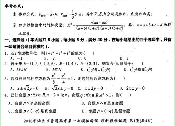 广东省汕头市2015年普通高考第一次模拟考试(数学理)扫描版