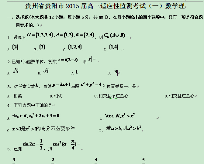 贵州省贵阳市2015届高三适应性监测考试(一)(数学理)